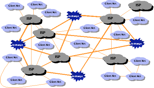The resultant environment of the Internet today is one where there are three basic means of interconnection between two ISPS: firstly where there is no direct interconnection, in which case the mutually exchanged traffic uses the services of intermediaries to act as transit providers, secondly where one ISP acts as the supplier and is funded in this role by the other ISP assuming the role of customer, and, lastly, where the ISPs undertake a peering arrangement and no financial exchange takes place. The resultant structure of the Internet is a little more chaotic, as Figure 2 indicates.