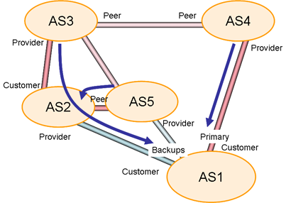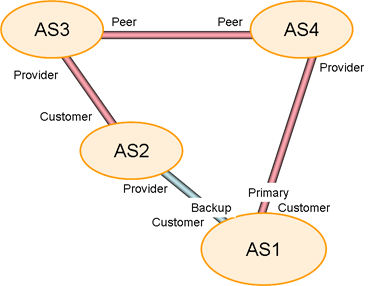 If the AS1 AS4 path is broken, AS4 will withdraw its advertisement of AS1's routes toAS3, who, in turn will send a withdrawal to AS2. As2, will then select the backup path to AS1. AS2 will advertise this path to AS3, and AS3 will advertise this path to AS4. Again, this is part of the intended operation of the primary / backup policy setting. (Figure 3)