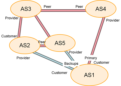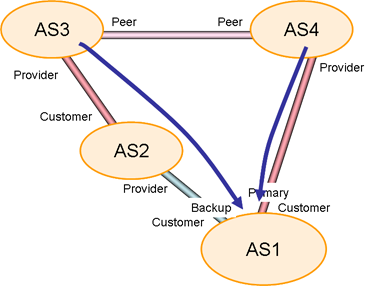 In this case AS1 has marked its advertisement of prefixes to AS2 as "backup only", and its advertisement of prefixes to AS4 as "primary". AS3 will hear AS4's advertisement across the peering link, and pick of AS1's prefixes with the path "AS4, AS1". AS3 will advertise this to AS2. AS2 will hear two paths to AS1, the first is by the direct connection to AS1, and the second is via the path "AS3, AS4, AS1". AS2 will prefer the longer path as the directly connected routes are marked "backup only", and AS2's local preference decision will prefer the AS3 advertisement over the AS1 advertisement. This is the intended outcome of AS1's policy settings, where no traffic passes from AS2 to AS1, and AS2, reaches AS1 via a path that transits AS3 and AS4. (Figure 2)