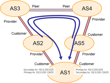 The intended configuration has all incoming traffic for addresses in the range 192.9.200.0/25 via the link from AS5, and all incoming traffic for addresses in the range 192.9.200.128/25 from AS2.