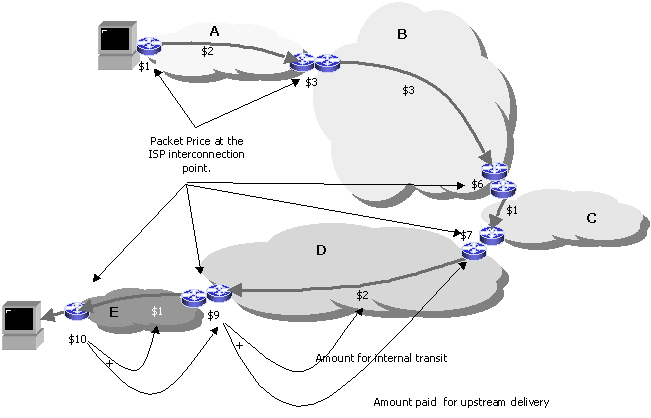 A potential settlement model could be constructed from this observation. The strawman model is that whenever a packet is passed across a network boundary, the packet is effectively sold to the next provider. The sale price increases as the packet transits through the network, accumulating value in direct proportion to the distance the packet traverses within the network. Each boundary packet sale price reflects the previous sale price, plus the value added in transiting the ISP's infrastructure. Ultimately, the packet is sold to the destination client.