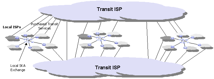 A common outcome of widespread use of SKA interconnections is a provider structure that is segregated into two domains - a set of transit ISPs, whose predominate investment direction is in terms of high-capacity carriage infrastructure and high-capacity switching systems, and a collection of local access ISPs, whose predominate investment direction is in service infrastructure supporting a strong retail focus. Local ISPs participate at exchanges and announce local routes at the exchange on an SKA basis of interconnection with peer ISPs. Such ISPs are strongly motivated to prefer to use all routes presented at the exchange within such peering sessions, because the ISP is not charged any transit cost for the traffic under an SKA settlement structure. The exchange does not provide comprehensive connectivity to the ISP, and this connectivity needs to be complemented with a separate purchase of transit services. In this role, the local ISP becomes a client of one or more transit ISPs explicitly for the purpose of access to transit connectivity services.