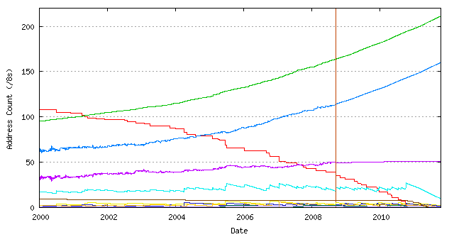 The anticipated rate of consumption of addresses from this central pool of unallocated IPv4 addresses is expected to average 15 /8's per year over 2009, and slightly more in 2010.