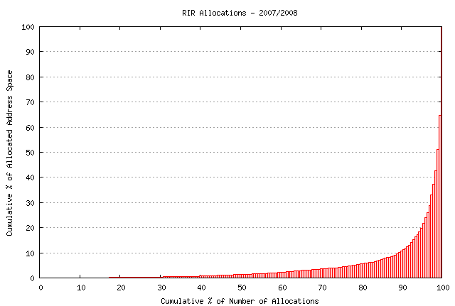 The second factor is the skewed distribution of addresses in this model. In the period from 1 January 2007 until 20 July 2008 there were 10,402 allocation or assignments transactions recorded in the RIRs' daily statistics files. These transactions accounted for a total 324,022,704 individual IPv4 addresses, or the equivalent of 19.3 /8's. Precisely one half of this address space was allocated or assigned in just 107 such transactions. In other words, some 1% of the recipients of address space in the past 18 months have received some 50% of all the allocated address space. The distribution of allocation sizes is indicated in Figure 5. The reason why this distribution is relevant here is that this predictive exercise assumes that while individual actions are hard to predict with any certainty, the aggregate outcome of many individuals' actions assumes a much greater level of predictability. This observation about aggregate behaviour is not the case in this situation, and the predictive exercise is very sensitive to the individual actions of a very small number of recipients of address space because of this skewed distribution of allocations. Any change in the motivations of these larger-sized actors that results in an acceleration of demand for IPv4 will have a very significant impact on the predictions of the longevity of the remaining unallocated IPv4 address pool.
