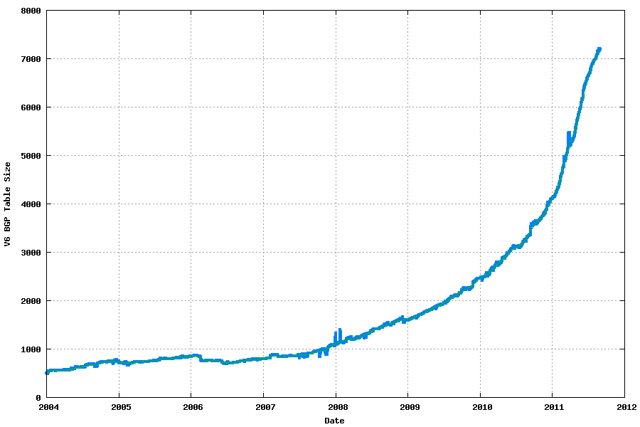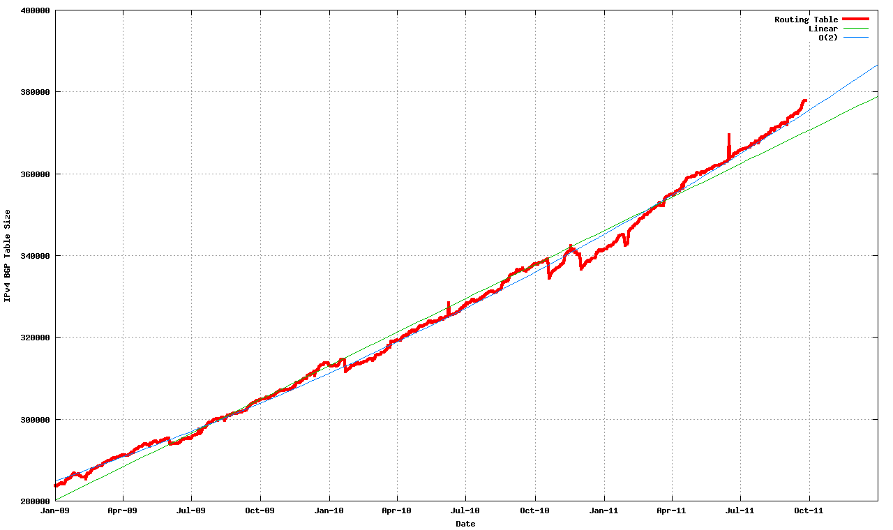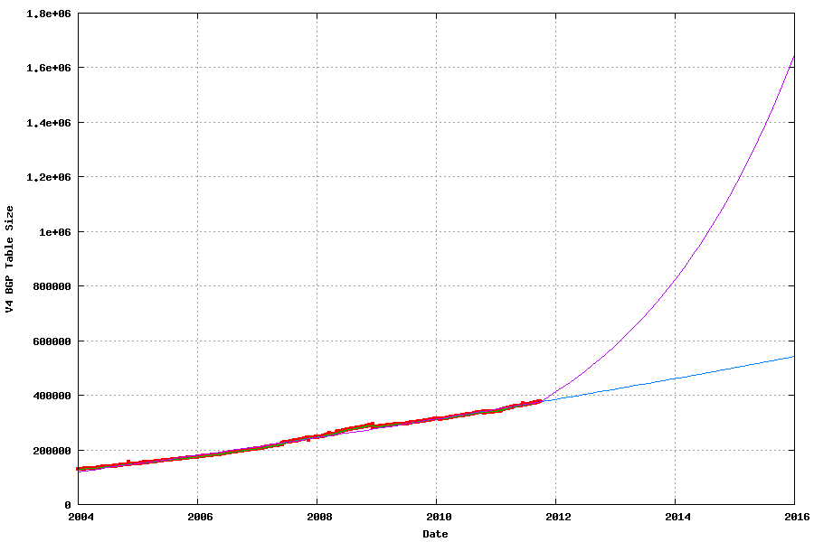 Of course, if address exhaustion causes a rapid doubling on the routing table across 2012, inflating the routing table by early 2014 to a size of 2 million entries or more, then this would represent a somewhat different scenario. What could potentially drive this rapid inflation scenario is some form of IPv4 address redistribution function that is focussed solely on the public addressing requirements in IPv4 NAT scenarios, probably increasing the prevalence of global routes at the /24 level, or potentially at even smaller prefix sizes. Such scenarios are related to the levels of speculation concerning the industry reaction to the exhaustion of the existing mechanism of IPv4 address distribution, and at this point in time the predictions about the nature of the redistribution function and the pressures placed on the routing space in consequence are highly speculative.