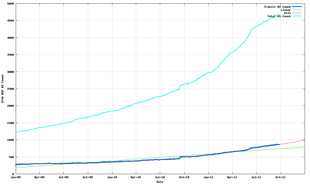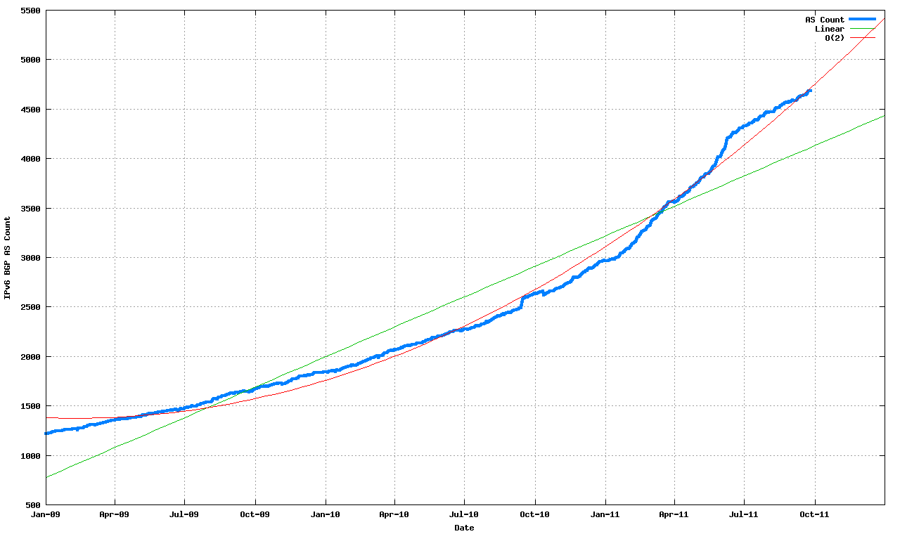 Here are those "J-curves" that have disappeared from the IPv4 network, particularly when looking at the growth of the number of entries in the IPv6 routing table and the number of Autonomous System numbers. The rate of growth in the IPv6 network is currently exponential growth with a doubling interval of every 12 – 14 months. There are a number of interesting aspects to this growth where the characteristics of IPv4 look to be appearing in IPv6. The number of more specific advertisements of existing aggregate announcements is rising faster than the number of aggregate announcements. More specifics are now 25% of the total IPv6 routing table. Also the number of transit AS networks is falling, and its now 18% of all AS's in IPv6, as compared to 13% in IPv4. However there is one major aspect of 2011 that is the major event in the IPv6 routing year so far.