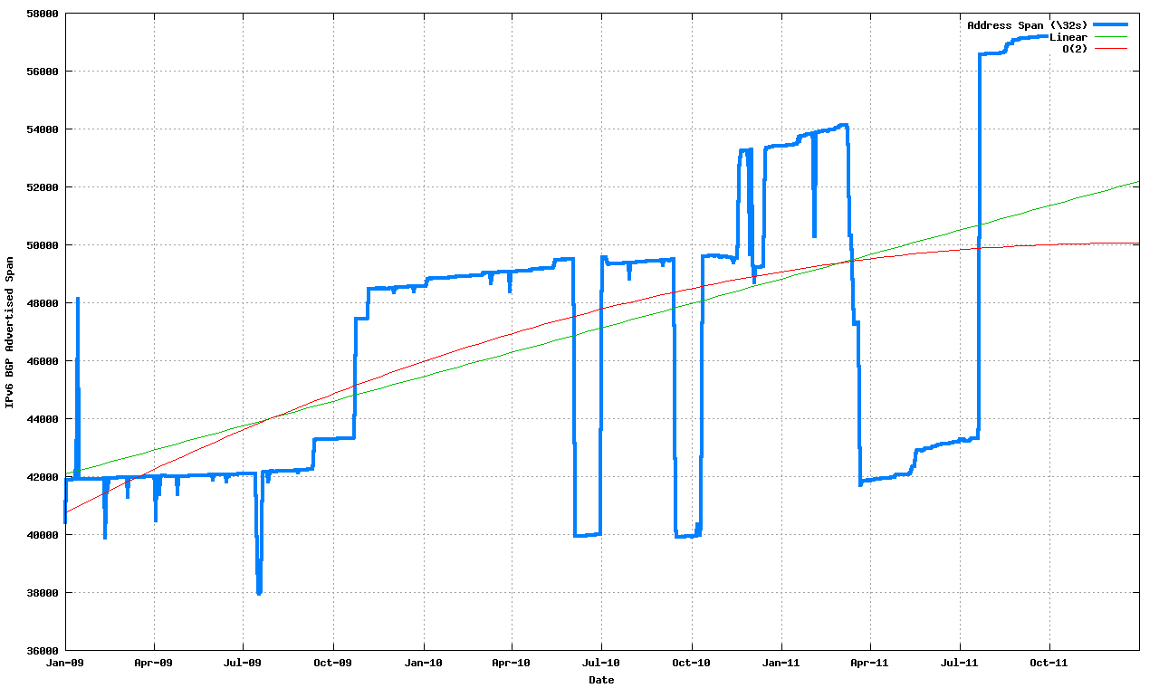 These two curves are projected through to January 2016 in Figure 23. The two curves show different outcomes, but not only in fine detail. Both curves indicate a current growth momentum for IPv6 such that in 4 years time the IPv6 routing table will still be under 100,000 entries.