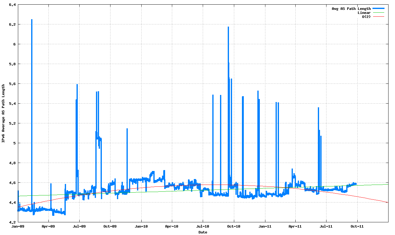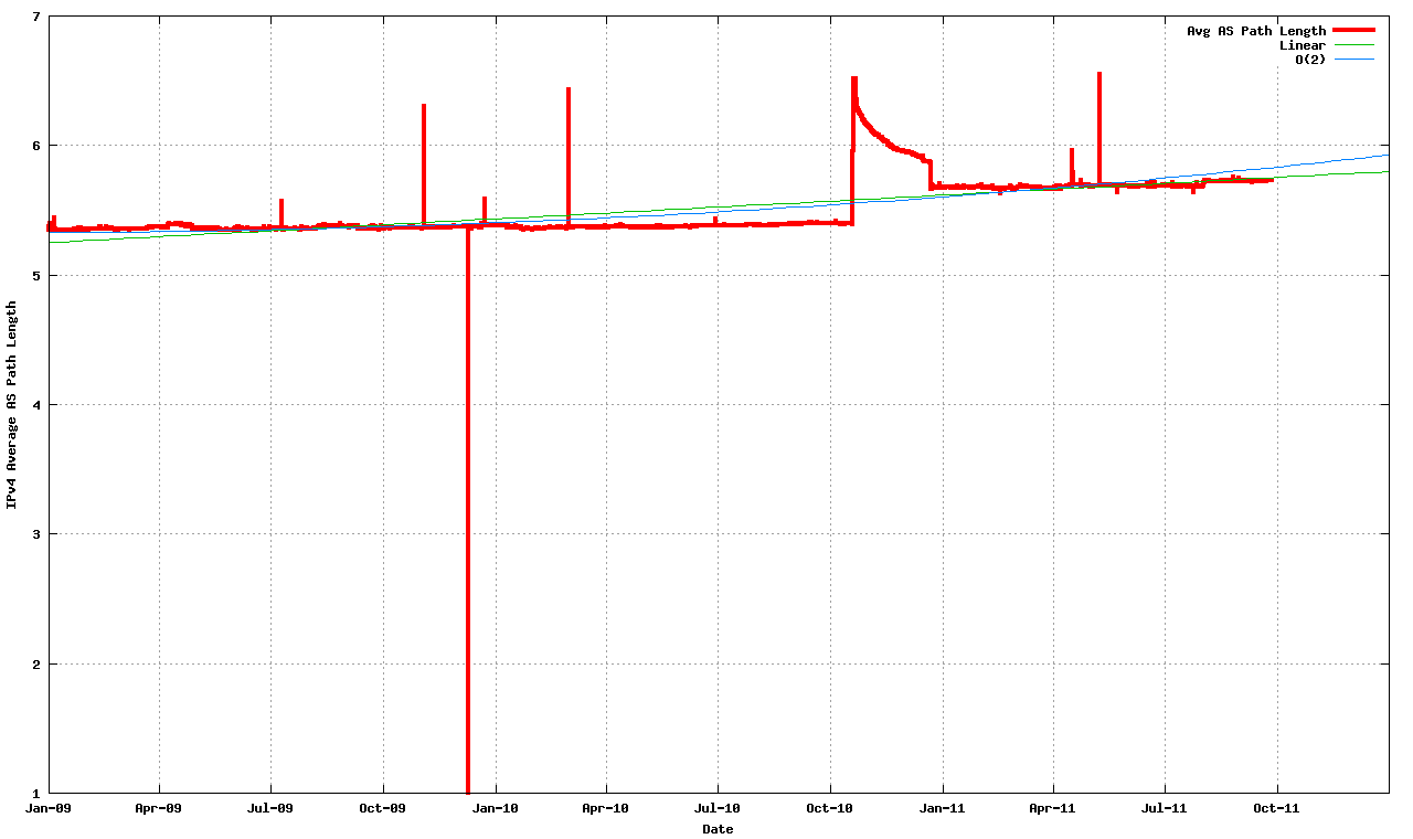 Other observations about the trends of the IPv4 BGP routing system include noting that the use (or abuse!) of more specifics in the routing system has not improved, nor has it become significantly worse. The average size of advertisements is slowly getting smaller in terms of address span per routing table entry, as is the span of originating addresses per origin AS. The average AS path length is constant at around 5 AS hops (which would translate to 4 AS hops if the measurement setup overhead was removed). The number of AS's is increasing at a very regular pace, and the interconnection degree of AS's is getting higher. The implication of this collection of observations is that the granularity of the IPv4 inter-domain routing system continues to get finer, albeit more slowly than in the past, and the density of interconnection continues to increase. The growth of the Internet is not "growth at the edge" as the network is not getting any larger in terms of average AS path change. Instead, the growth is happening by increasing the density of the network by attaching new networks into the existing transit structure and peering at established exchange points. This makes for a network whose diameter, measured in AS hops, is essentially static, yet whose density, measured in terms of prefix count, AS interconnectivity and AS Path diversity, continues to increase. This denser mesh of interconnectivity could be potentially problematical in terms of convergence times if the BGP routing system used a dense mesh of peer connectivity, but the topology of the network continues along a clustered hub and spoke model, where a small number of transit ASs directly service a large number of stub edge networks.
