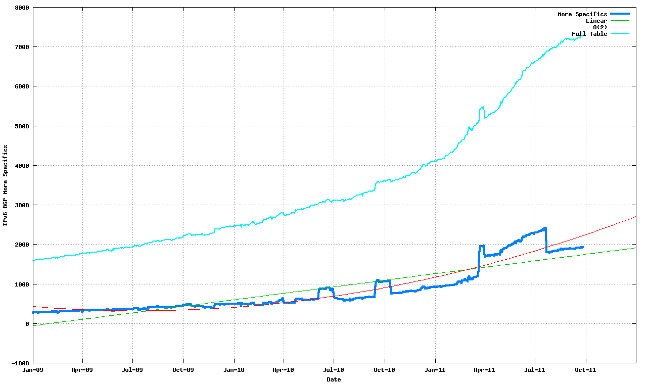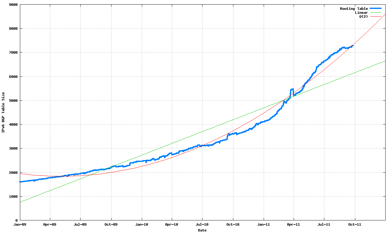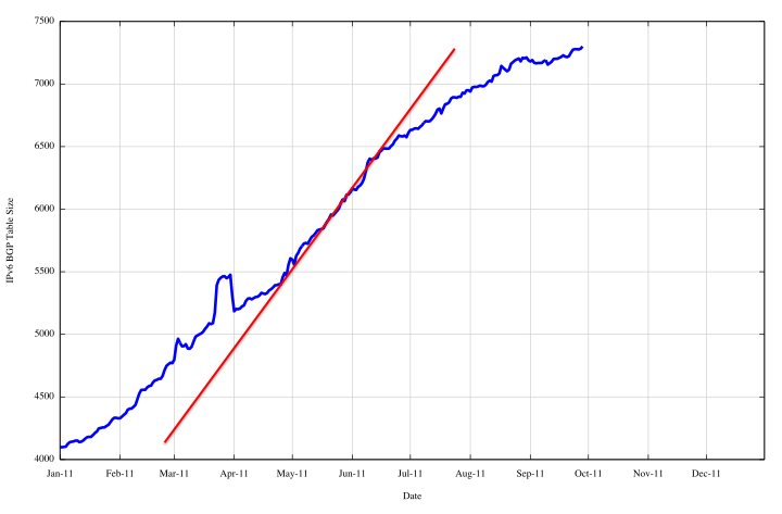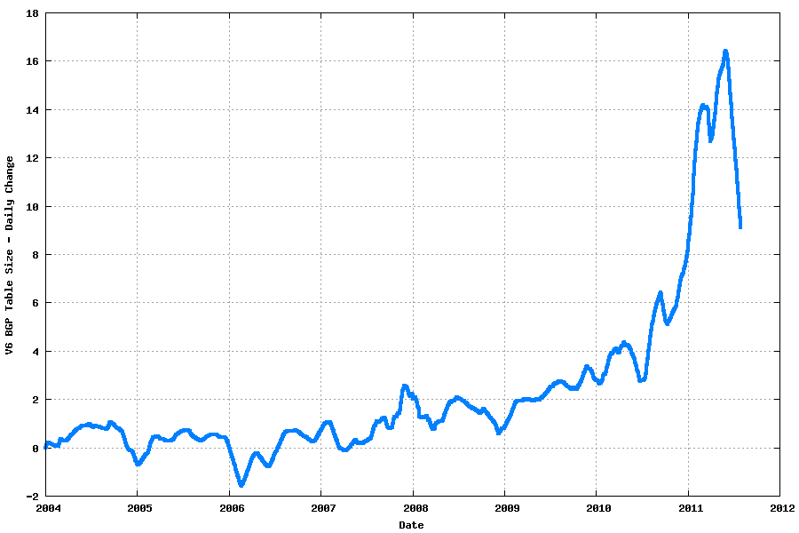 However to put this into some relative perspective with the IPv4 routing table, at the start of 2011 when the IPv6 routing table growth rate peaked at 14 new routing entries per day, the IPv4 routing table was experiencing a peak of some 150 new routing table entries per day.
