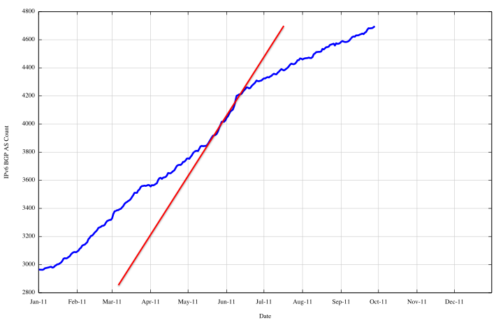 There is one 6 week period where the growth rates were substantially higher than the rest of the year, namely the period from the end of April 2011 until the first week of June 2011. This period starts with the exhaustion of the remaining IPv4 address pool in APNIC, and ends with World IPv6 day (Figures 14 and 15). These events, particularly World IPv6 data provided a focal point for IPv6 efforts in the year, and these figures show that these events had a visible impact in the routing metrics of IPv6 in terms of IPv6 takeup.