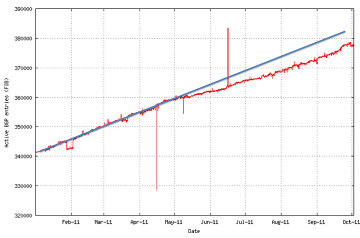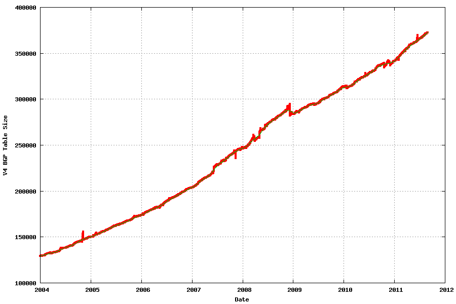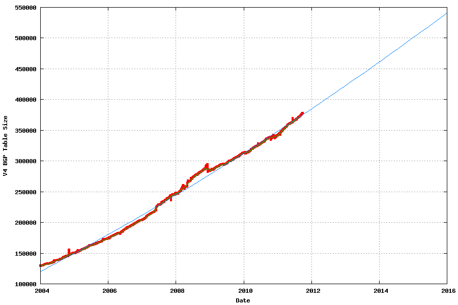 With the caveat that this prediction is based on the assumption that tomorrow is a lot like today and that the influences that shape tomorrow have already shaped today, then its reasonable to predict that the routing table in a little over three years time, at the start of 2015, will contain an additional 120,000 entries, making a total for IPv4 of some 500,000 entries in the BGP routing table at that time.