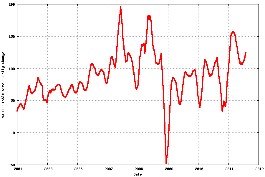 The first order differential, or the rate of growth, of the BGP routing table is shown in Figure 17. This figure is perhaps the most obvious illustration of the correlation between the growth in the Internet, as measured by the growth in the Internet's routing table, and the broader economic conditions in the world. The tend of growth from 2004 showed a sharp decline in late 2008, and the subsequent recovery in early 2009 established a new trend of growth which has still not yet recovered to the levels seen in mid 2007 and 2008.