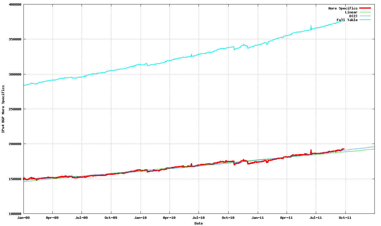 There are a few discontinuities in the plot, coinciding with efforts by a number of ISPs to aggregate their routing advertisements into a smaller advertised set of routes. Such efforts are notable positive steps in alleviating the constant pressure of growth in the routing system, but these aggregation measures are not hugely significant, in that they have pushed back the overall timetable of routing growth by a small number of weeks at best.