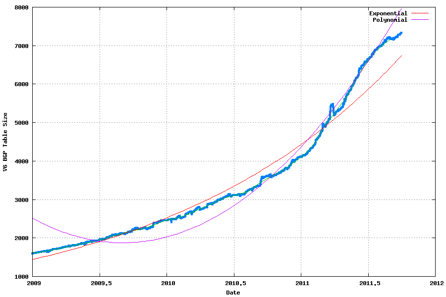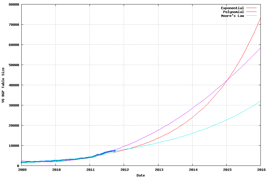 One possible model that could be used as a benchmark of a prediction of constant unit cost in terms of this form of routing and packet forwarding hardware in packet networks is Moore's Law . Here the general assumption is that as long as the growth parameters of the routing table sit within the parameters of Moore's law then the expectation is that the unit cost of routing and switching hardware should not escalate to any appreciable extent. The following figure compares the quadratic projection model of the size of the BGP default free zone with an exponential model of doubling every two years, as used in Moore's Law. As can be seen in the figure below there is no real cause for alarm at this stage, and the BGP table size appears to fit comfortably within these parameters within the current projection model.