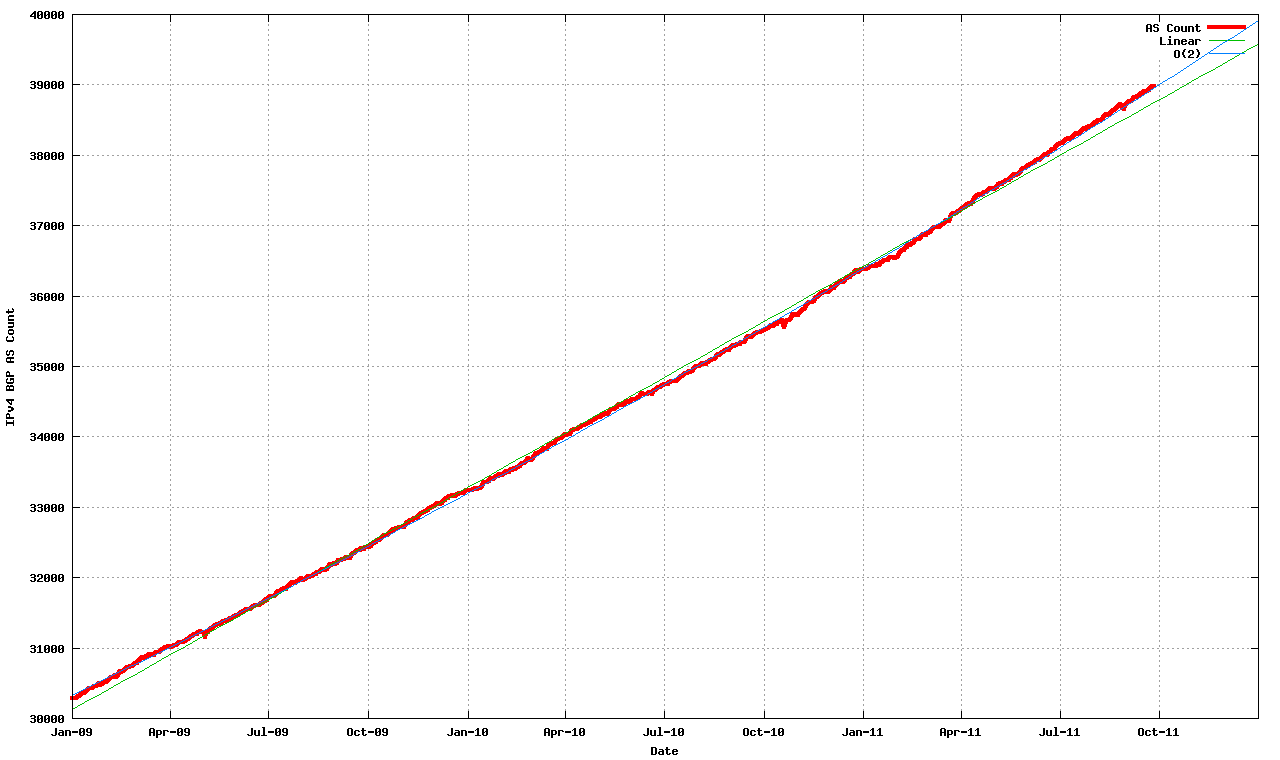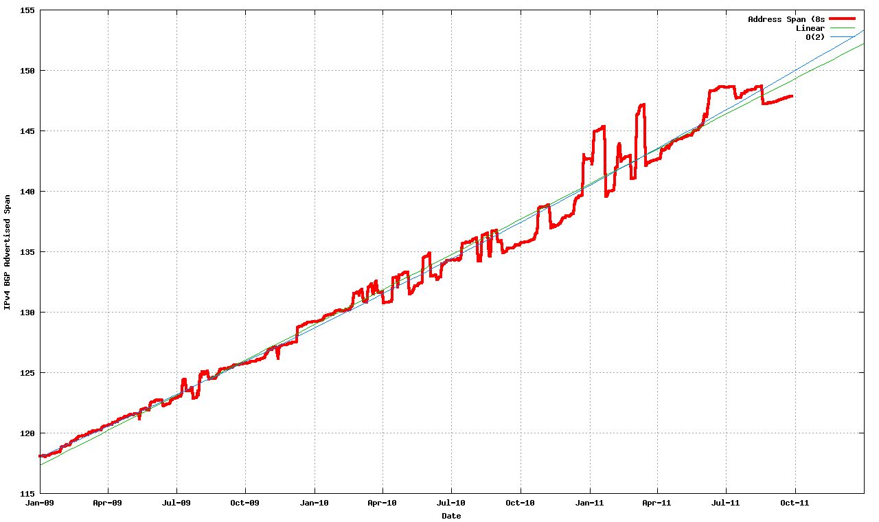 At the outset it's appropriate to observe that this is a time of extreme uncertainty in the BGP prediction business! The run out of the Ipv4 address pool in the Asia Pacific region will be followed by a similar run down in the European and the Middle East anticipated to occur in the first half of 2012, and the run down in North America will follow some time thereafter. What was observed in the Asia Pacific region was an initial dampening on the growth in the address table, but there is some expectation that once an after-market picks up momentum there will be movement of address fragments into the routing table, with the potential to cause significant growth in the number of entries in the routing table. Quantifying this is extremely difficult, as this is a case where the past is a poor indicator of the future.