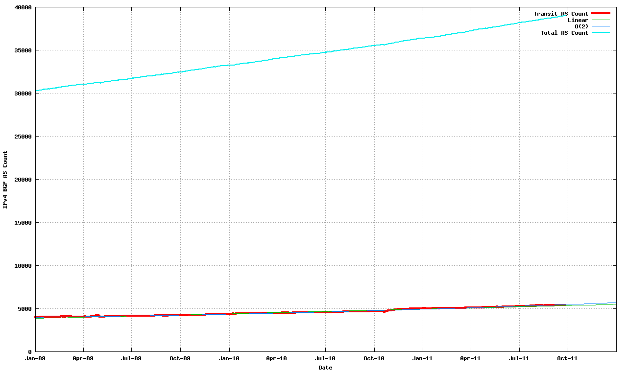 However, buried in Figure 1 is one significant event, namely the exhaustion of the IPv4 address space pools in APNIC, serving the Asia Pacific region, in the last week of April 2011. This event triggered an immediate change in the growth trends of the routing table. However the reaction to exhaustion was not an immediate upward spike in the number of routing table entries, as some folk have been expecting. The reaction has been a shift to a suppressed growth model (see Figure 7). Its likely that the interruption to the steady inflow of new address allocations in the Asian region has been partly responsible for a dropping of the rate of growth of the routing system in the remainder of 2011. It is also appropriate to note that in the same period we have witnessed the second round of a major financial recession in many parts of the world, and the continued suppression of routing growth in the latter part of 2011 may have as much to do with widespread adverse economic conditions in many parts of the world as it has to do with the change of the IPv4 Internet growth model in the Asia Pacific region due to the IPv4 address run out.