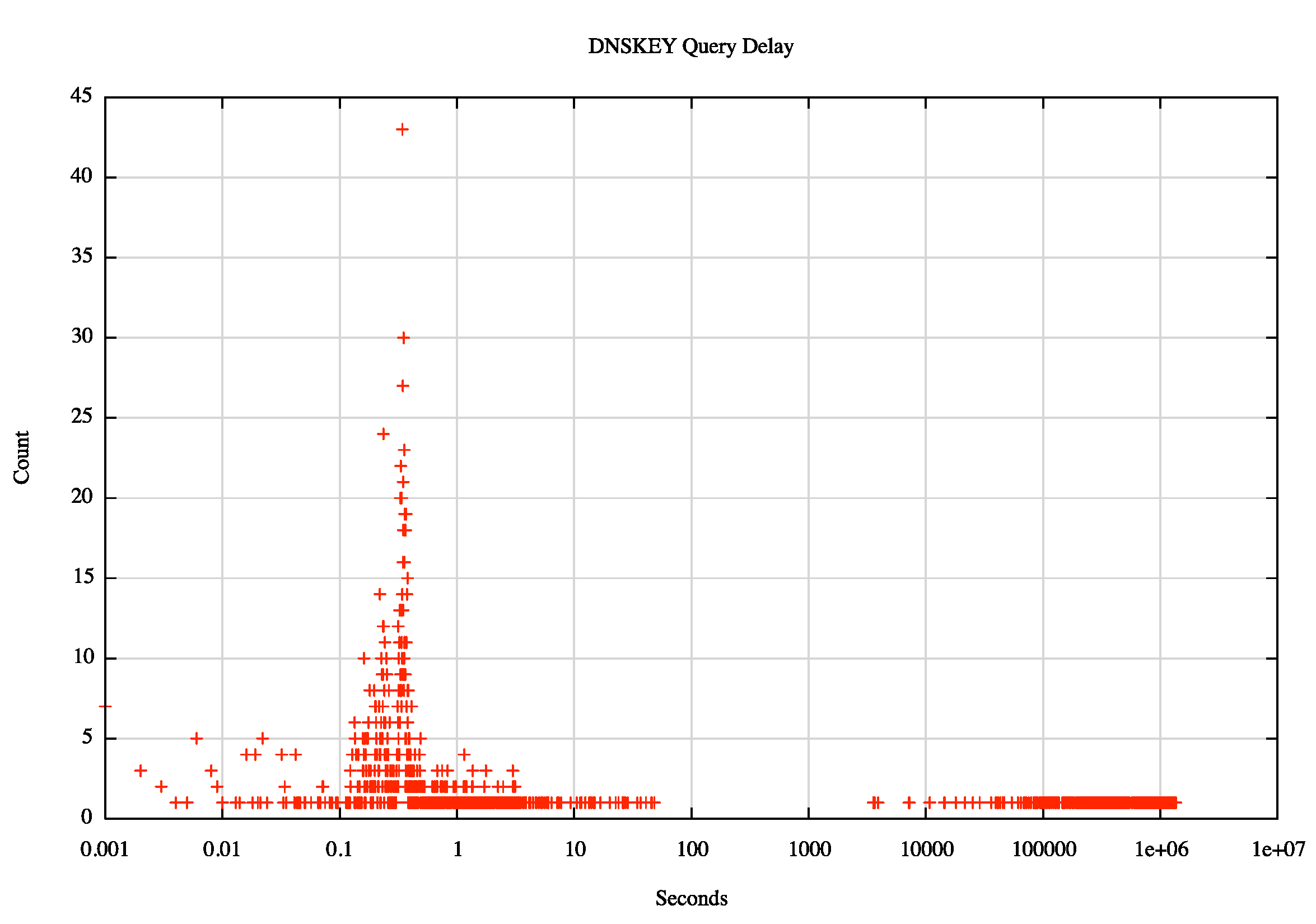 The distribution of the elapsed time between the first query seen from each resolver and the DNSKEY query is shown in the following figure. The figure shows a pronounced peak at a delay of 200ms (the x axis uses a logarithmic scale in this figure), and there is a visible waning after 3 seconds.