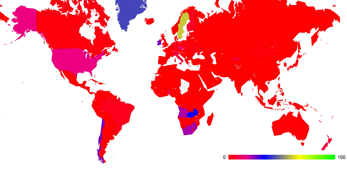 Once again is it possible to feed this data into a map of the world and paint each country with a color that denotes the level of coverage of DNSSEC. This is shown in Figure 4. (The data used to generate this map can be found at http://labs.apnic.net/dnssec/hosts_by_cc_2.txt)