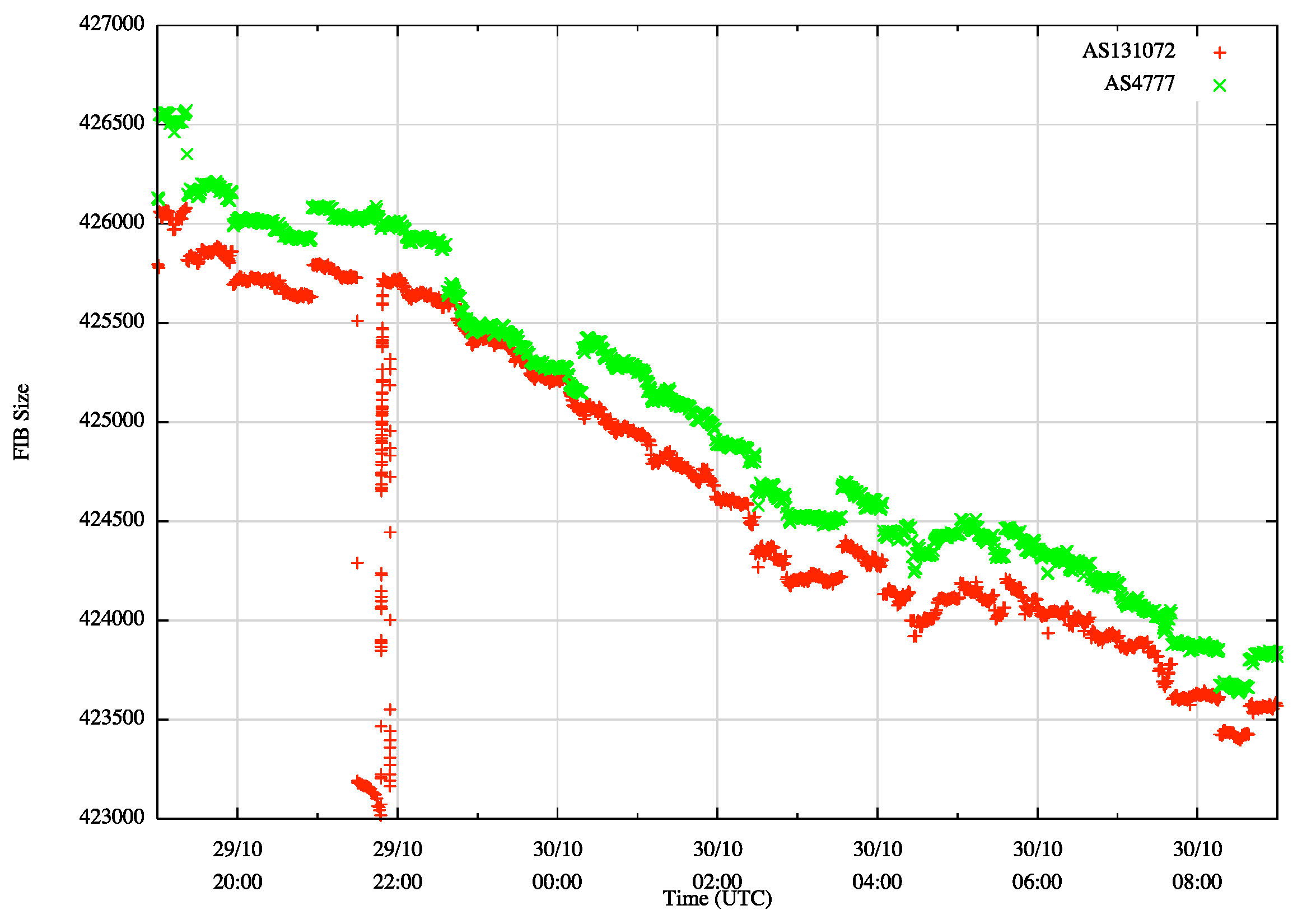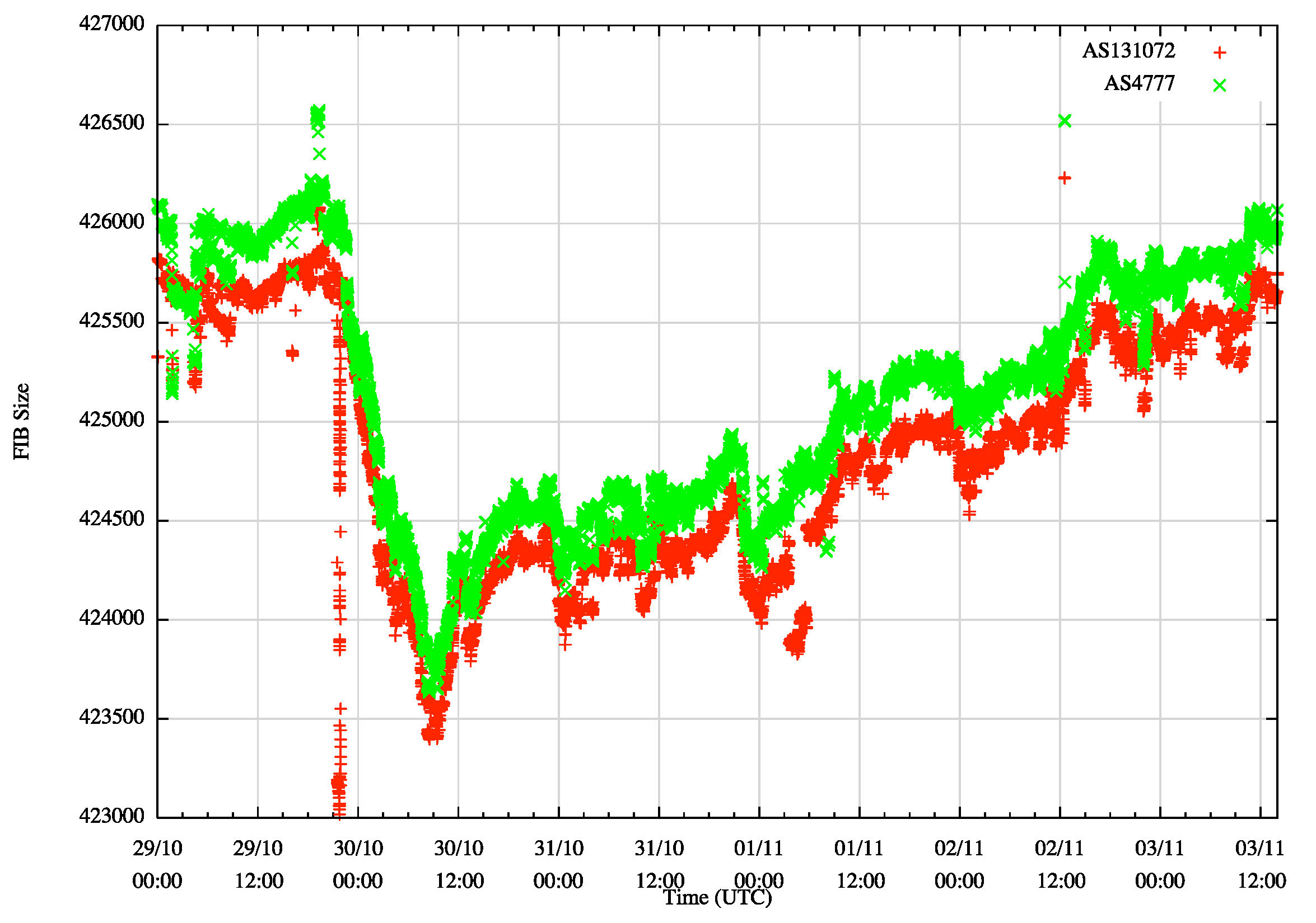 One way to answer this question is to examine the Internet's routing table during this time. Figure 4 shows a second-by-second plot of the size of the BGP forwarding from the start of the 29th October (0000UTC) to the end of the 3rd November (2359 UTC) based on scanning the logged BGP updates from a router located in Japan, in AS 4777 and a second router located in Australia, in AS 131072.