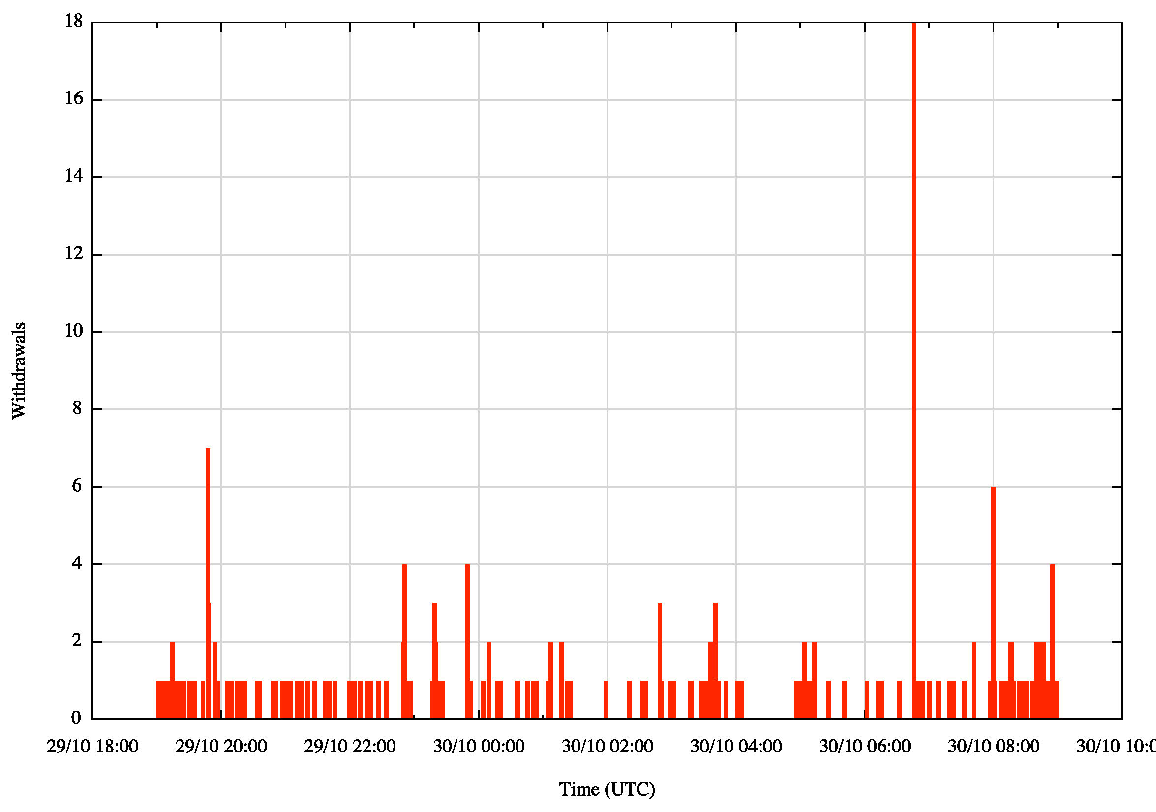 What about the other large set of routes, those 224 withdrawn routes from Russia? This presents differently, in so far as there is no single event that withdraws the majority of these routes. There is a steady trickle of single withdrawals over the 14 hour period, with just one event withdrawing 18 routes (Figure 7). Many of these routes include AS 12389 (ROSTELECOM), and AS12389 has connections to a number of providers for transit towards Asia/Pacific, including AS1273 (Cable and Wireless), AS2914 (NTT America), AS25165 (KDDI), AS3257 (TINET) and AS6762 (SEABONE, Telecom Italia). Over this 14 hour period we saw some 20,453 updates relating to these Russian routes, but the level of service disruption in terms of extended period of unreachability was much lower.