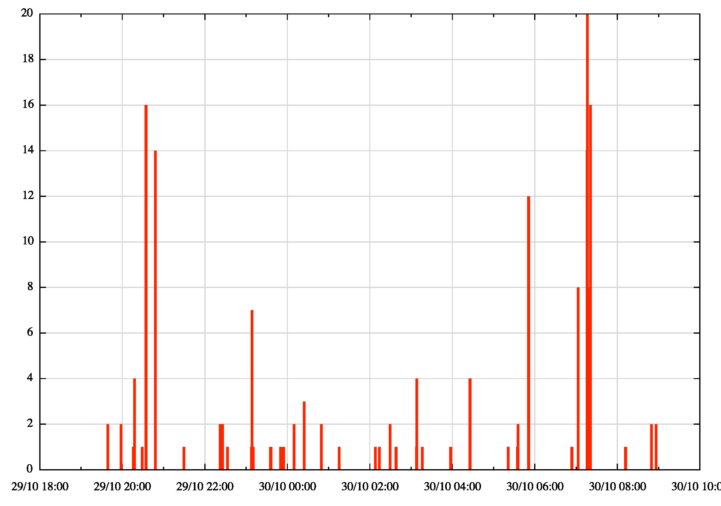 Again we can look at the time distribution of extended outages of Brazilian routes, were the withdrawn prefix was not restored during the 14 hour period of the storm's landfall. Once more there is no sharp peak of withdrawals observed for this collection of routes (Figure 9).