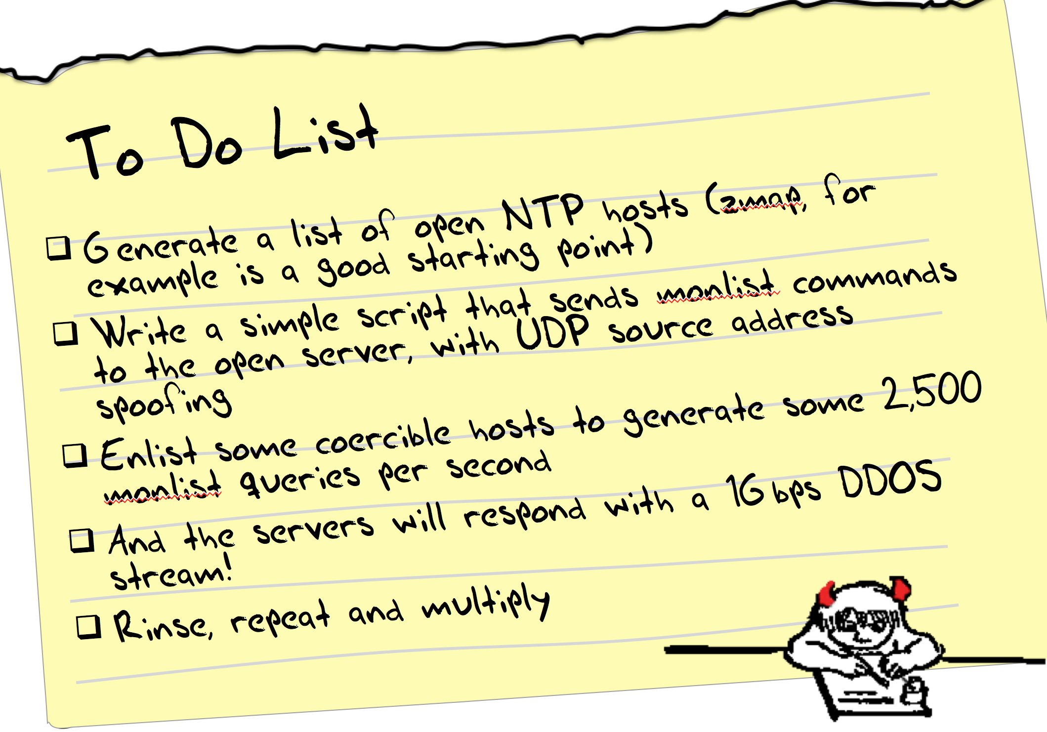 NTP is the Network Time Protocol, and it is used by computers to synchronixe their time of day clocks. NTP is a UDP-based protocol, and it is widely deployed. So how does it fare against our criteria for being used for DDOS attacks?