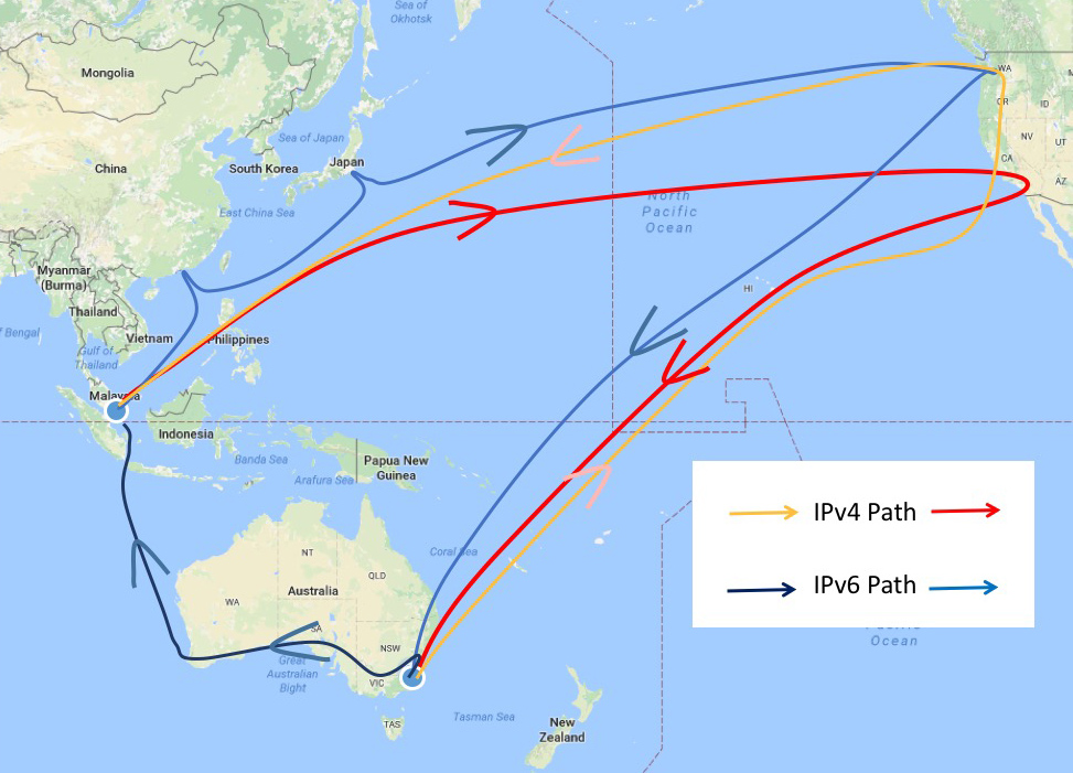 The traceroute data also shows why this is the case. In the case of IPv4, the packet path to and from Singapore involves crossing the Pacific Ocean 4 times, as the forward and return paths involve directing the traffic through a router located on the west coast of the United States. In the case of IPv6 there is an asymmetric path where the outbound packets from Canberra to Singapore transit across a submarine cable system that runs North-South across the Indian ocean between Perth and Singapore. This path difference is shown on the map below.