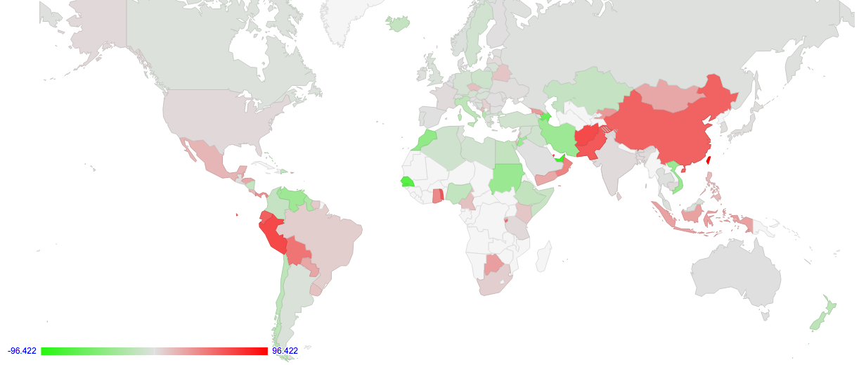 Each country is coloured based on a relative RTT metric. This metric is computed by looking at the two RTT times for each dual stack client (in milliseconds) and subtracting the IPv4 RTT from the IPv6 RTT. In the example shown at the start of this article, the IPv6 RTT is 213ms, while the IPv4 RTT is 315ms. The result of the subtraction is -102ms, indicating that in this particular case the IPv6 RTT is 102ms faster than IPv4. These individual measurements are collected for each country (the country is determined by geo-locating the IPv4 part of the dual stack address pair), and the last 30 days measurements are used to generate an average value for each country.