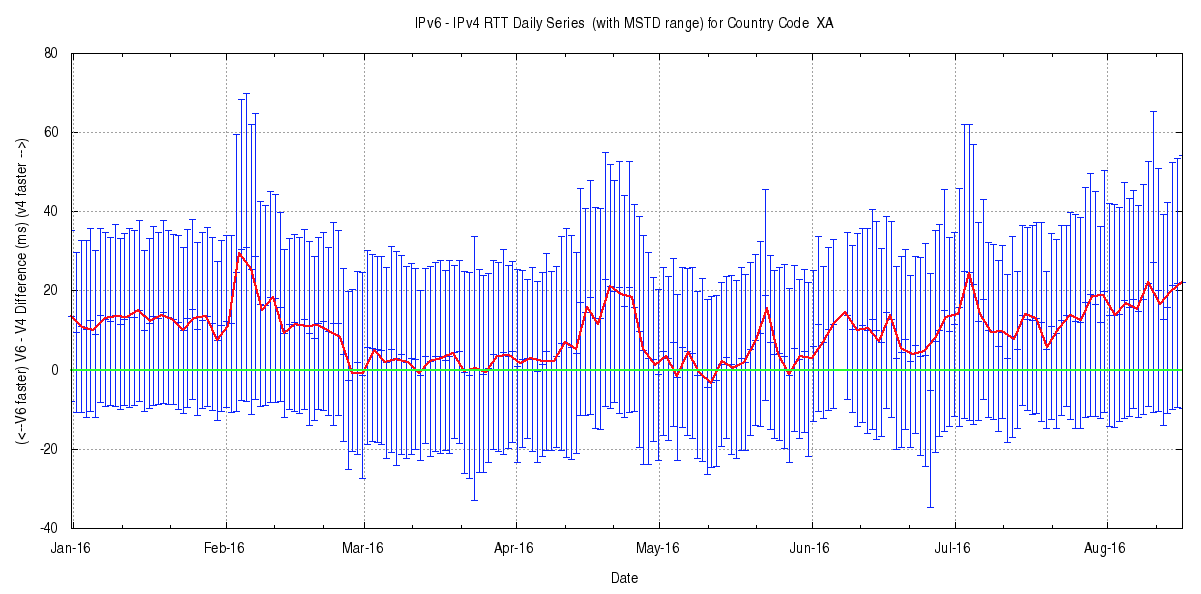 The data used to colour the map is also reproduced in the tables in the second half of the page. This table is helpful in so far as often a single average value can conceal a wealth of information. What the table shows that the map cannot is the number of sample points on which the map was based. For example, while the average RTT difference in the Dominican Republic was 93.4ms in favour of IPv6 being faster, this result is based on the measurement of a single dual stack host. A more reliable number is drawn from Vietnam, where averaged across 4,479 values, IPv6 was on average 36.07ms faster.
