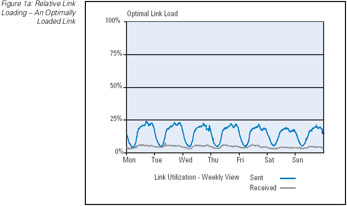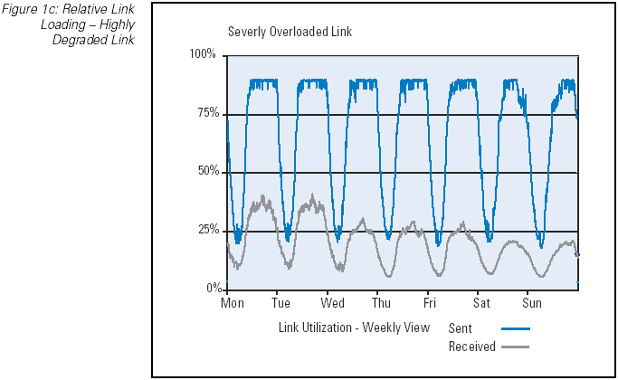 The most basic tool for measuring network performance is the periodic measurement of the interface byte counters. Such measurements can provide a picture of the current traffic levels on the network link, and when related to the total capacity of the link, the relative link loading level can be provided. As a performance indicator this relative link loading level can provide some indication of link performance, in that a relatively lightly loaded link (such as a load of 5 to 10 percent of total available capacity) would normally indicate a link that has no significant performance implications, whereas a link operating at 100 percent of total available capacity would likely be experiencing high levels of packet drop, queuing delay, and potentially a high jitter level. (Figure 1) In between these two extremes there are performance implications of increasing the load. Of course it should be noted that the characteristics of the link have a bearing on the interpretation of the load levels, and a low-latency 10-Gbps link operating at 90-percent load will have very significantly lower levels of performance degradation than a 2-Mbps high-latency link under the same 90-percent load. (Figure 2)