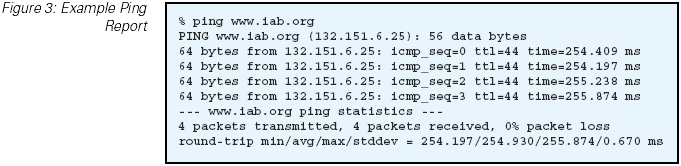 The best known, and most widely used active measurement tool is ping. Ping is a very simple tool: a sender generates an Internet Control Message Protocol (ICMP) echo request packet, and directs it to a target system. As the packet is sent, the sender starts a timer. The target system simply reverses the ICMP headers and sends the packet back to the sender as an ICMP echo reply. When the packet arrives at the original sender's system, the timer is halted and the elapsed time is reported. An example ping output is shown in Figure 3.